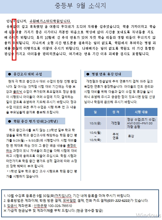 2025년 중등부 9월 소식지(가정통신문) 페이지 정보 작성자 최고관리자 작성일 25-09-19 21:17 조회 606회 댓글 0건 본문 * 10월 등록은 9월 30일(화)까지입니다.