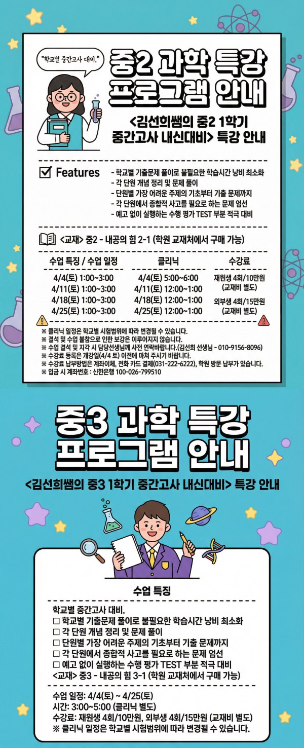 중등 1학기 과학 내신대비 프로그램 개강 안내 페이지 정보 작성자 최고관리자 작성일 26-03-12 15:41 조회 215회 댓글 0건 본문 중등 1학기 과학 내신대비 프로그램 개강 안내